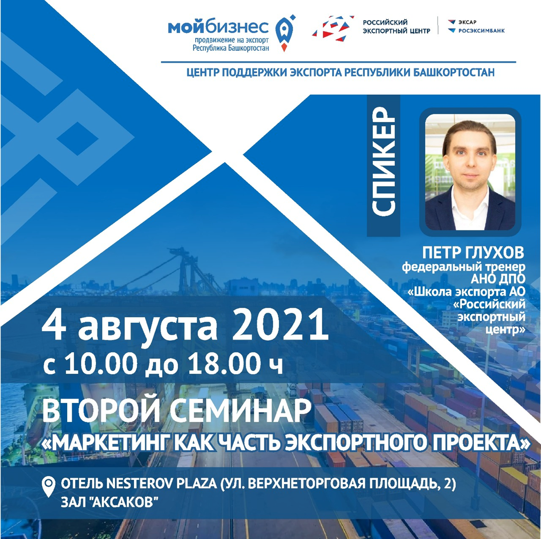 4 августа 2021 года с 10:00-18:00 в отеле Nesterov Plaza (ул. Верхнеторговая площадь, 2), зал «Аксаков» состоится второй семинар «Маркетинг как часть экспортного проекта» программы «Жизненный цикл экспортного проекта».
